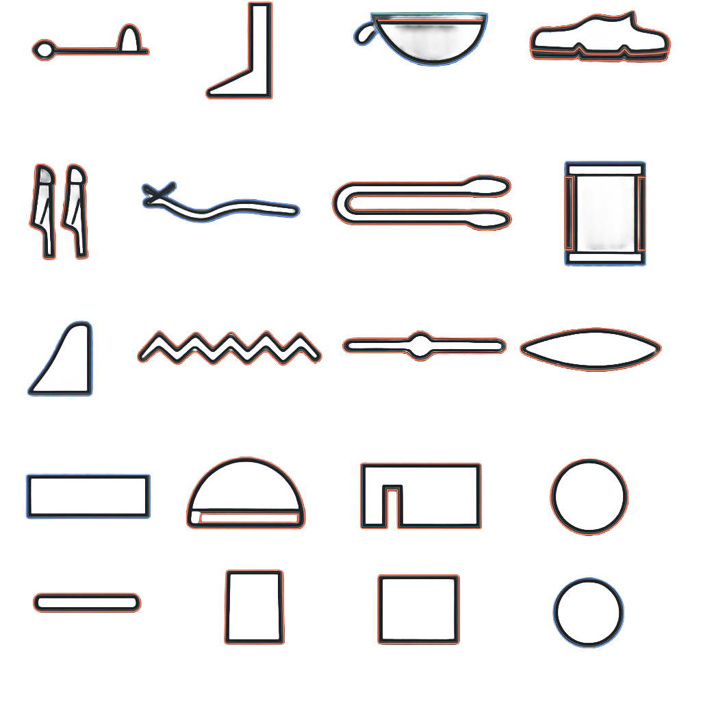 16 common Egyptian symbols traced and matched to English letters